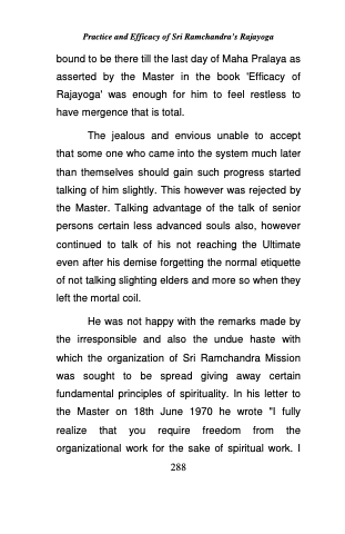 He was not happy with the remarks made by the irresponsible and also the undue haste with which the organization of Sri Ramchandra Mission was sought to be spread giving away certain fundamental principles of spirituality. In his letter to the Master on 18th June 1970 he wrote "I fully realize that you require freedom from the organizational work for the sake of spiritual work. I