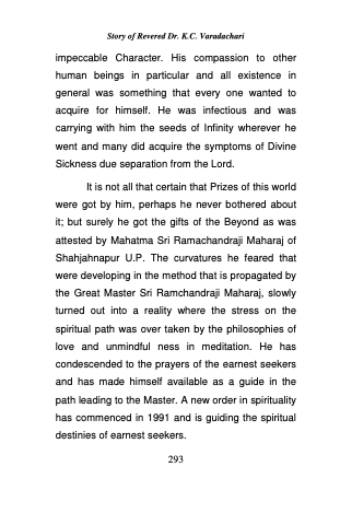 impeccable Character. His compassion to other human beings in particular and all existence in general was something that every one wanted to acquire for himself. He was infectious and was carrying with him the seeds of Infinity wherever he went and many did acquire the symptoms of Divine Sickness due separation from the Lord.