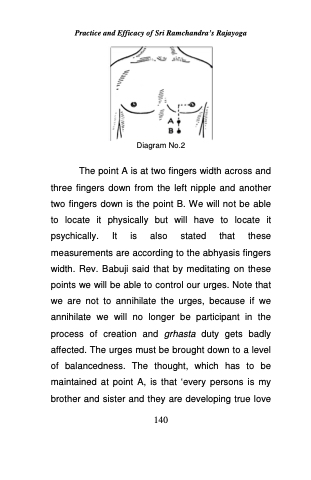 The point A is at two fingers width across and three fingers down from the left nipple and another two fingers down is the point B. We will not be able to locate it physically but will have to locate it psychically. It is also stated that these measurements are according to the abhyasis fingers width. Rev. Babuji said that by meditating on these points we will be able to control our urges. Note that we are not to annihilate the urges, because if we annihilate we will no longer be participant in the process of creation and grhasta duty gets badly affected. The urges must be brought down to a level of balancedness. The thought, which has to be maintained at point A, is that ‘every persons is my brother and sister and they are developing true love