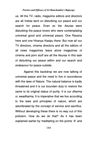 us. All the TV, radio, magazine editors and directors are all Indras bent on disturbing our peace and our search for peace. Even so the Asuras were disturbing the peace lovers who were contemplating universal good and universal peace. One Ravana here and one Hiranya Kasipu there. But now all our TV directors, cinema directors and all the editors of all news magazines leave alone magazines of cinema and porn stuff are all the Asuras in this task of disturbing our peace within and our search and endeavour for peace outside.