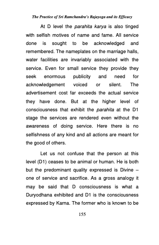 At D level the parahita karya is also tinged with selfish motives of name and fame. All service done is sought to be acknowledged and remembered. The nameplates on the marriage halls, water facilities are invariably associated with the service. Even for small service they provide they seek enormous publicity and need for acknowledgement voiced or silent. The advertisement cost far exceeds the actual service they have done. But at the higher level of consciousness that exhibit the parahita at the D1 stage the services are rendered even without the awareness of doing service. Here there is no selfishness of any kind and all actions are meant for the good of others.