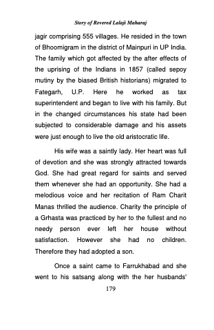 jagir comprising 555 villages. He resided in the town of Bhoomigram in the district of Mainpuri in UP India. The family which got affected by the after effects of the uprising of the Indians in 1857 (called sepoy mutiny by the biased British historians) migrated to Fategarh, U.P. Here he worked as tax superintendent and began to live with his family. But in the changed circumstances his state had been subjected to considerable damage and his assets were just enough to live the old aristocratic life.