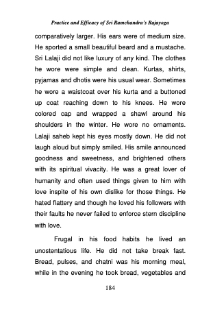 comparatively larger. His ears were of medium size. He sported a small beautiful beard and a mustache. Sri Lalaji did not like luxury of any kind. The clothes he wore were simple and clean. Kurtas, shirts, pyjamas and dhotis were his usual wear. Sometimes he wore a waistcoat over his kurta and a buttoned up coat reaching down to his knees. He wore colored cap and wrapped a shawl around his shoulders in the winter. He wore no ornaments. Lalaji saheb kept his eyes mostly down. He did not laugh aloud but simply smiled. His smile announced goodness and sweetness, and brightened others with its spiritual vivacity. He was a great lover of humanity and often used things given to him with love inspite of his own dislike for those things. He hated flattery and though he loved his followers with their faults he never failed to enforce stern discipline with love.