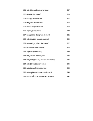 101. ఆతమ్దరశ్నము (Amtadarsanamu) 207 102. గురుకృప (Gurukrupa) 210 103. వనుమ్కత్ి (Jeevanmukti) 212 104. ఆామ్నంద (Atmananda) 215 105. జనలోకము (Janalokamu) 218 106. మరగ్దిశ్ (Margadarsi) 220 107. సంపజర్ ఞ్సమాి (Samprajna Samadhi) 221 108. అైవ్ానుభూ (Advaitaanubhuti) 225 109. అహంబర్ మ్ిమ్ (Aham Brahmasmi) 227 110. అనంానంద (Anantananda) 229 111. రమ్లము (Nirmalamu) 230 112. ఆతమ్లయము (Atmalayamu) 232 113. అమృాావ్ధనము (Amritaaswadhanamu) 234 114. గురుోర్హము (Gurudrohamu) 236 115. బహర్ మ్పథము (Brahmapadamu) 238 116. అసంపజర్ ఞ్సమాి (Asamprajna Samadhi) 240 117. మానస సోవరము (Manasa Sarovaramu) 242