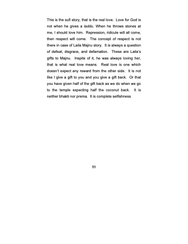 This is the sufi story, that is the real love. Love for God is not when he gives a laddu. When he throws stones at me, I should love him. Repression, ridicule will all come, then respect will come. The concept of respect is not there in case of Laila Majnu story. It is always a question of defeat, disgrace, and defamation. These are Laila’s gifts to Majnu. Inspite of it, he was always loving her, that is what real love means. Real love is one which doesn’t expect any reward from the other side. It is not like I give a gift to you and you give a gift back. Or that you have given half of the gift back as we do when we go to the temple expecting half the coconut back. It is neither bhakti nor prema. It is complete selfishness