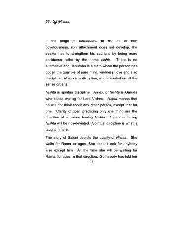 The story of Sabari depicts the quality of Nishta. She waits for Rama for ages. She doesn’t look for anybody else except him. All the time she will be waiting for Rama, for ages, in that direction. Somebody has told her 97