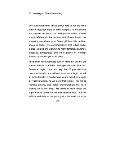 The chanchalatvamu talked about here is not the initial state of disturbed state of mind (kshipta). If the lessons are however not learnt, the mind gets disturbed. If there is any deficiency in the development of nirmoha and not accepting everything as a Divine gift then this problem becomes acute. The nirmalachittamu that is had earlier is also lost and one wanders to many temples, churches, mosques, synagogues and other places of worship. Firming up has not yet taken place.