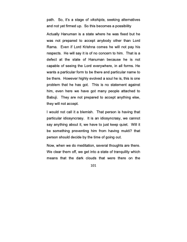 Actually Hanuman is a state where he was fixed but he was not prepared to accept anybody other than Lord Rama. Even if Lord Krishna comes he will not pay his respects. He will say it is of no concern to him. That is a defect at the state of Hanuman because he is not capable of seeing the Lord everywhere, in all forms. He wants a particular form to be there and particular name to be there. However highly evolved a soul he is, this is one problem that he has got. This is no statement against him, even here we have got many people attached to Babuji. They are not prepared to accept anything else, they will not accept.