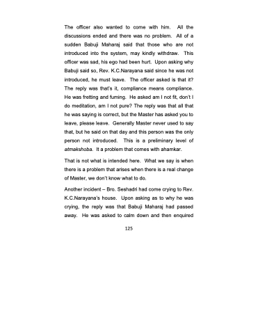 The officer also wanted to come with him. All the discussions ended and there was no problem. All of a sudden Babuji Maharaj said that those who are not introduced into the system, may kindly withdraw. This officer was sad, his ego had been hurt. Upon asking why Babuji said so, Rev. K.C.Narayana said since he was not introduced, he must leave. The officer asked is that it? The reply was that’s it, compliance means compliance. He was fretting and fuming. He asked am I not fit, don’t I do meditation, am I not pure? The reply was that all that he was saying is correct, but the Master has asked you to leave, please leave. Generally Master never used to say that, but he said on that day and this person was the only person not introduced. This is a preliminary level of atmakshoba. It a problem that comes with ahamkar.
