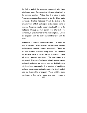 the feeling and all the emotions connected with it and attachment also. For sometime it is restricting itself to the physical location. At that time it is called a preta. Preta sarira ceases after sometime, but the bhuta sarira continues. It is this that goes through the torture of the tamasic world of hell and enjoys at the rajasic world of heaven. The preta may be present for about 1 day or the traditional 13 days and may persist even after that. For sometime, it gets attached to the physical place. Unless it is disgusted with the body, it would like to be with the body.