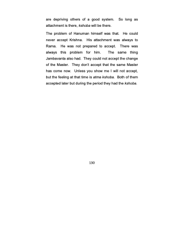 The problem of Hanuman himself was that. He could never accept Krishna. His attachment was always to Rama. He was not prepared to accept. There was always this problem for him. The same thing Jambavanta also had. They could not accept the change of the Master. They don’t accept that the same Master has come now. Unless you show me I will not accept, but the feeling at that time is atma kshoba. Both of them accepted later but during the period they had the kshoba.