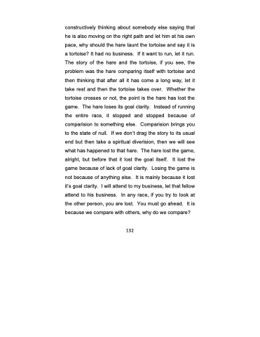 constructively thinking about somebody else saying that he is also moving on the right path and let him at his own pace, why should the hare taunt the tortoise and say it is a tortoise? It had no business. If it want to run, let it run. The story of the hare and the tortoise, if you see, the problem was the hare comparing itself with tortoise and then thinking that after all it has come a long way, let it take rest and then the tortoise takes over. Whether the tortoise crosses or not, the point is the hare has lost the game. The hare loses its goal clarity. Instead of running the entire race, it stopped and stopped because of comparision to something else. Comparision brings you to the state of null. If we don’t drag the story to its usual end but then take a spiritual diverision, then we will see what has happened to that hare. The hare lost the game, alright, but before that it lost the goal itself. It lost the game because of lack of goal clarity. Losing the game is not because of anything else. It is mainly because it lost it’s goal clarity. I will attend to my business, let that fellow attend to his business. In any race, if you try to look at the other person, you are lost. You must go ahead. It is because we compare with others, why do we compare?