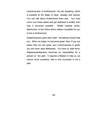 consciousness of brotherhood, not just speaking, which is possible at the stage of daya, vatsalya and karuna. You can talk about brotherhood there also. You must come over those states and get stabilized in bhakti, then only it becomes possible. Bhakti towards divine, attachment to the divine alone makes it possible for you to live in brotherhood.