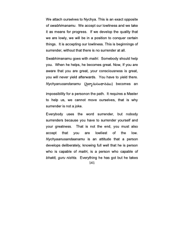 Everybody uses the word surrender, but nobody surrenders because you have to surrender yourself and your greatness. That is not the end, you must also accept that you are lowliest of the low. Nychyaanusandaanamu is an attitude that a person develops deliberately, knowing full well that he is person who is capable of maitri, is a person who capable of