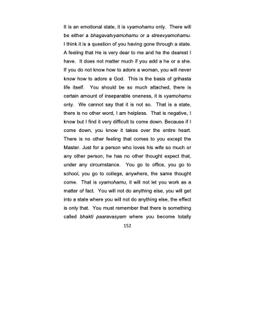 It is an emotional state, it is vyamohamu only. There will be either a bhagavatvyamohamu or a streevyamohamu. I think it is a question of you having gone through a state. A feeling that He is very dear to me and he the dearest I have. It does not matter much if you add a he or a she. If you do not know how to adore a woman, you will never know how to adore a God. This is the basis of grihasta life itself. You should be so much attached, there is certain amount of inseparable oneness, it is vyamohamu only. We cannot say that it is not so. That is a state, there is no other word, I am helpless. That is negative, I know but I find it very difficult to come down. Because if I come down, you know it takes over the entire heart. There is no other feeling that comes to you except the Master. Just for a person who loves his wife so much or any other person, he has no other thought expect that, under any circumstance. You go to office, you go to school, you go to college, anywhere, the same thought come. That is vyamohamu, it will not let you work as a matter of fact. You will not do anything else, you will get into a state where you will not do anything else, the effect is only that. You must remember that there is something called bhakti paaravasyam where you become totally 152