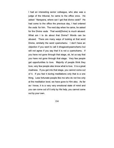 I had an interesting senior colleague, who also was a judge of the tribunal, he came to the office once. He asked ‘ Narayana, where can I get that divine vada?’ He had come to the office the previous day, I had ordered the vada for him. The next day when he came, he asked for the Divine vada. That word(Divine) is much abused. What am I to do about that Divine? Words can be abused. There are many ways of looking at that word Divine, similarly the word vyamohamu. I don’t have an objection if you want to call it bhagavatvyaamohamu but will not agree if you say that it is not a vyamohamu. If you have not gone through that stage, ok, let us say that you have not gone through that stage. Very few people get opportunities to love. Majority of people think they love, very few people also know what is love. It is a great madness. If you get into that stage, you cannot come out of it. If you feel it during meditations only that is a one thing. Less fortunate people like me who do not live only at the meditation level, we have gone to Him also. As far as I know, it is a very very emotional state of mind and you can come out of it only by His help, you cannot come out by your own.