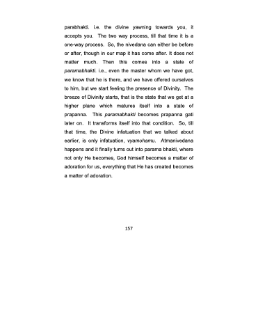 parabhakti. i.e. the divine yawning towards you, it accepts you. The two way process, till that time it is a one-way process. So, the nivedana can either be before or after, though in our map it has come after. It does not matter much. Then this comes into a state of paramabhakti. i.e., even the master whom we have got, we know that he is there, and we have offered ourselves to him, but we start feeling the presence of Divinity. The breeze of Divinity starts, that is the state that we get at a higher plane which matures itself into a state of prapanna. This paramabhakti becomes prapanna gati later on. It transforms itself into that condition. So, till that time, the Divine infatuation that we talked about earlier, is only infatuation, vyamohamu. Atmanivedana happens and it finally turns out into parama bhakti, where not only He becomes, God himself becomes a matter of adoration for us, everything that He has created becomes a matter of adoration.