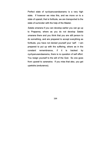 Satata smarana if you can develop earlier you can go up to Prapanna, where as you do not develop Satata smarana there and you think that you are still person to do something, and are prepared to accept everything as fortitude, you have not denied yourself your ‘self’. I am prepared to put up with the suffering, where as in the constant remembrance, if it is backed by nychyanusandaanamu, there is no question of self effort. You resign yourself to the will of the God. So one goes from uparati to saranatva. If you miss that also, you get upeksha (endurance).