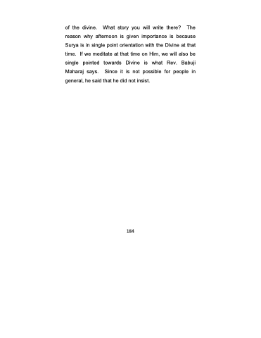of the divine. What story you will write there? The reason why afternoon is given importance is because Surya is in single point orientation with the Divine at that time. If we meditate at that time on Him, we will also be single pointed towards Divine is what Rev. Babuji Maharaj says. Since it is not possible for people in general, he said that he did not insist.