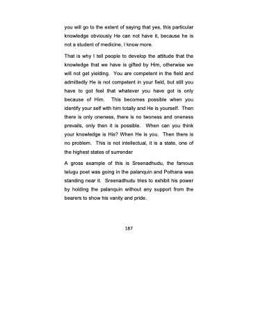 That is why I tell people to develop the attitude that the knowledge that we have is gifted by Him, otherwise we will not get yielding. You are competent in the field and admittedly He is not competent in your field, but still you have to got feel that whatever you have got is only because of Him. This becomes possible when you identify your self with him totally and He is yourself. Then there is only oneness, there is no twoness and oneness prevails, only then it is possible. When can you think your knowledge is His? When He is you. Then there is no problem. This is not intellectual, it is a state, one of the highest states of surrender