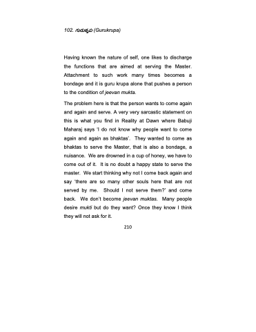 Having known the nature of self, one likes to discharge the functions that are aimed at serving the Master. Attachment to such work many times becomes a bondage and it is guru krupa alone that pushes a person to the condition of jeevan mukta.