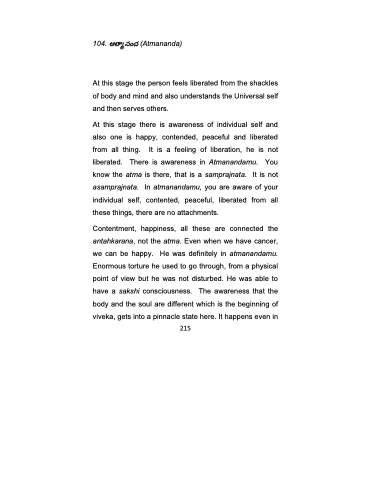 Contentment, happiness, all these are connected the antahkarana, not the atma. Even when we have cancer, we can be happy. He was definitely in atmanandamu. Enormous torture he used to go through, from a physical point of view but he was not disturbed. He was able to have a sakshi consciousness. The awareness that the body and the soul are different which is the beginning of viveka, gets into a pinnacle state here. It happens even in 215