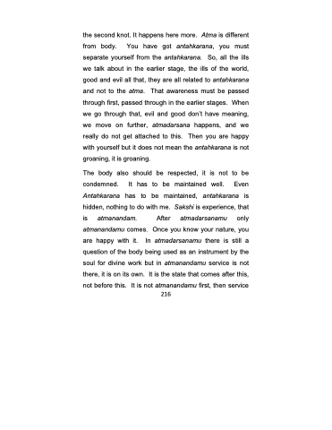 The body also should be respected, it is not to be condemned. It has to be maintained well. Even Antahkarana has to be maintained, antahkarana is hidden, nothing to do with me. Sakshi is experience, that is atmanandam. After atmadarsanamu only atmanandamu comes. Once you know your nature, you are happy with it. In atmadarsanamu there is still a question of the body being used as an instrument by the soul for divine work but in atmanandamu service is not there, it is on its own. It is the state that comes after this,