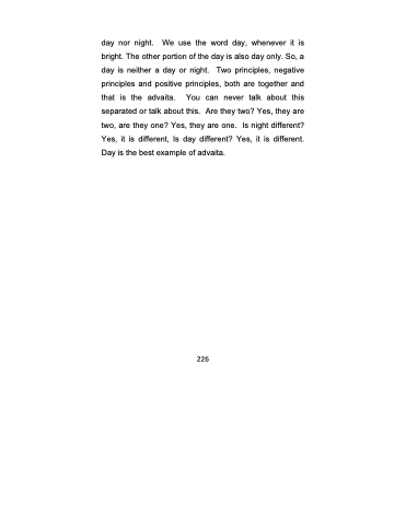 day nor night. We use the word day, whenever it is bright. The other portion of the day is also day only. So, a day is neither a day or night. Two principles, negative principles and positive principles, both are together and that is the advaita. You can never talk about this separated or talk about this. Are they two? Yes, they are two, are they one? Yes, they are one. Is night different? Yes, it is different, Is day different? Yes, it is different. Day is the best example of advaita.
