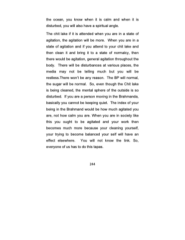 The chit lake if it is attended when you are in a state of agitation, the agitation will be more. When you are in a state of agitation and if you attend to your chit lake and then clean it and bring it to a state of normalcy, then there would be agitation, general agitation throughout the body. There will be disturbances at various places, the media may not be telling much but you will be restless.There won’t be any reason. The BP will normal, the sugar will be normal. So, even though the Chit lake is being cleaned, the mental sphere of the outside is so disturbed. If you are a person moving in the Brahmanda, basically you cannot be keeping quiet. The index of your being in the Brahmand would be how much agitated you are, not how calm you are. When you are in society like this you ought to be agitated and your work then becomes much more because your cleaning yourself, your trying to become balanced your self will have an effect elsewhere. You will not know the link. So, everyone of us has to do this tapas.