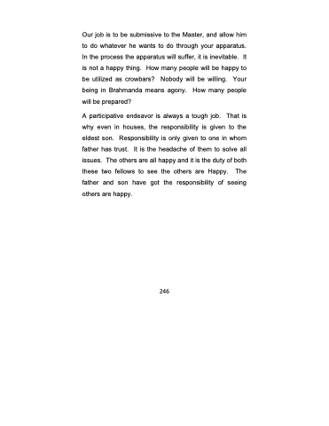 Our job is to be submissive to the Master, and allow him to do whatever he wants to do through your apparatus. In the process the apparatus will suffer, it is inevitable. It is not a happy thing. How many people will be happy to be utilized as crowbars? Nobody will be willing. Your being in Brahmanda means agony. How many people will be prepared?