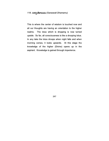 This is where the center of wisdom is touched now and all our thoughts are having an orientation to the higher realms. The lotus which is dropping is now turned upside. So far, all consciousness is like a drooping lotus. In any lake the lotus droops when night falls and when morning comes, it looks upwards. At this stage the knowledge of the higher (Divine) opens up in the aspirant. Knowledge is gained through imperience.