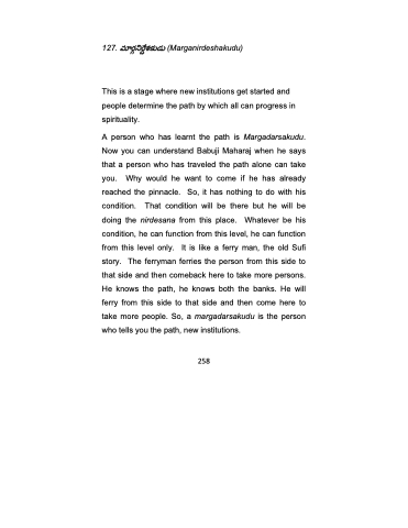 A person who has learnt the path is Margadarsakudu. Now you can understand Babuji Maharaj when he says that a person who has traveled the path alone can take you. Why would he want to come if he has already reached the pinnacle. So, it has nothing to do with his condition. That condition will be there but he will be doing the nirdesana from this place. Whatever be his condition, he can function from this level, he can function from this level only. It is like a ferry man, the old Sufi story. The ferryman ferries the person from this side to that side and then comeback here to take more persons. He knows the path, he knows both the banks. He will ferry from this side to that side and then come here to take more people. So, a margadarsakudu is the person who tells you the path, new institutions.