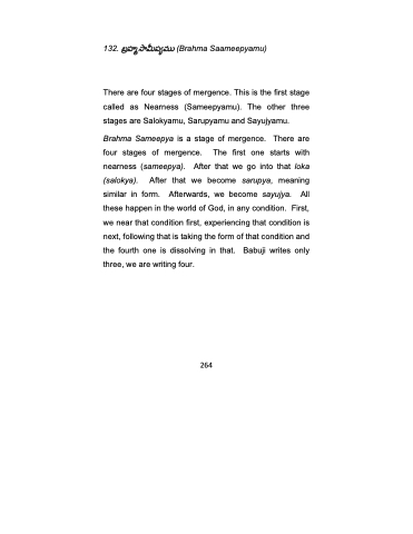 Brahma Sameepya is a stage of mergence. There are four stages of mergence. The first one starts with nearness (sameepya). After that we go into that loka (salokya). After that we become sarupya, meaning similar in form. Afterwards, we become sayujya. All these happen in the world of God, in any condition. First, we near that condition first, experiencing that condition is next, following that is taking the form of that condition and the fourth one is dissolving in that. Babuji writes only three, we are writing four.