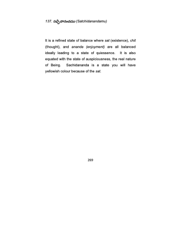 It is a refined state of balance where sat (existence), chit (thought), and ananda (enjoyment) are all balanced ideally leading to a state of quiessence. It is also equated with the state of auspiciousness, the real nature of Being. Sachidananda is a state you will have yellowish colour because of the sat.