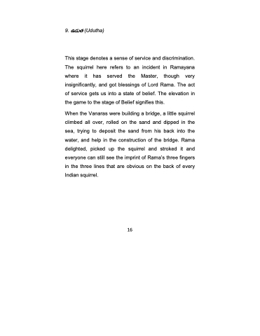 This stage denotes a sense of service and discrimination. The squirrel here refers to an incident in Ramayana where it has served the Master, though very insignificantly, and got blessings of Lord Rama. The act of service gets us into a state of belief. The elevation in the game to the stage of Belief signifies this.
