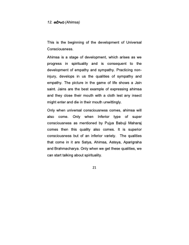 Ahimsa is a stage of development, which arises as we progress in spirituality and is consequent to the development of empathy and sympathy. Practicing non- injury, develops in us the qualities of sympathy and empathy. The picture in the game of life shows a Jain saint. Jains are the best example of expressing ahimsa and they close their mouth with a cloth lest any insect might enter and die in their mouth unwittingly.
