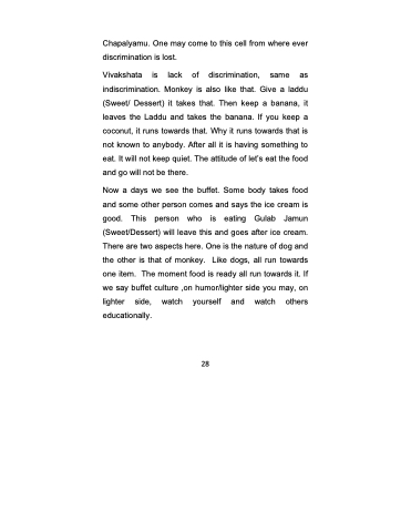 Vivakshata is lack of discrimination, same as indiscrimination. Monkey is also like that. Give a laddu (Sweet/ Dessert) it takes that. Then keep a banana, it leaves the Laddu and takes the banana. If you keep a coconut, it runs towards that. Why it runs towards that is not known to anybody. After all it is having something to eat. It will not keep quiet. The attitude of let’s eat the food and go will not be there.