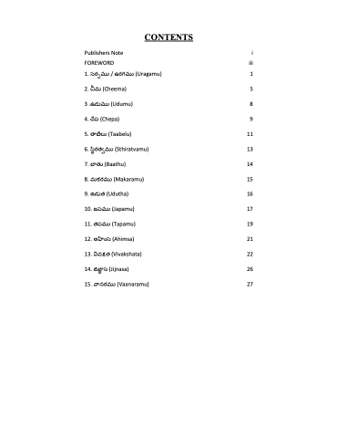 2. మ (Cheema) 5 3 .ఉడుము (Udumu) 8 4. ేప (Chepa) 9 5. ాబేలు (Taabelu) 11 6. థ్ిరతవ్ము (Sthiratvamu) 13 7. బాతు (Baathu) 14 8. మకరము (Makaramu) 15 9. ఉడుత (Udutha) 16 10. జపము (Japamu) 17 11. తపము (Tapamu) 19 12. అహింస (Ahimsa) 21 13. వకష్త (Vivakshata) 22 14. జఞ్ాస (Jijnasa) 26 15. ానరము (Vaanaramu) 27