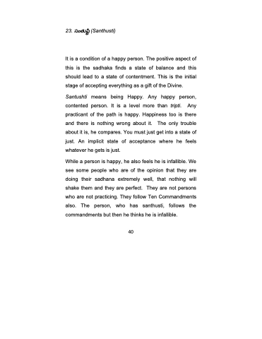 While a person is happy, he also feels he is infallible. We see some people who are of the opinion that they are doing their sadhana extremely well, that nothing will shake them and they are perfect. They are not persons who are not practicing. They follow Ten Commandments also. The person, who has santhusti, follows the commandments but then he thinks he is infallible.