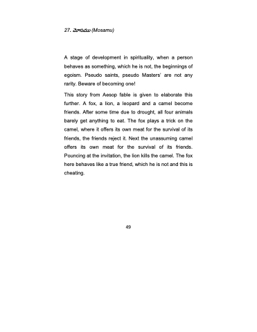 This story from Aesop fable is given to elaborate this further. A fox, a lion, a leopard and a camel become friends. After some time due to drought, all four animals barely get anything to eat. The fox plays a trick on the camel, where it offers its own meat for the survival of its friends, the friends reject it. Next the unassuming camel offers its own meat for the survival of its friends. Pouncing at the invitation, the lion kills the camel. The fox here behaves like a true friend, which he is not and this is cheating.