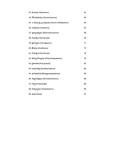 33. కామము (Kaamamu) 61 34. ోమితనము (Somaritanamu) 62 35. ఎ ందువు ై ాయ్నము (Point A Meditation): 63 36. సుతలము (Sutalamu) 65 37. బహర్ మ్చరయ్ము (Brahmacharyamu) 68 38. గురుకృప (Gurukrupa) 69 39. ైాగయ్ము (Vairagyamu) 71 40. కర్ోధము (Krodhamu) 72 41. గురుకృప (Gurukrupa) 76 42. హవ్ాపలయ్ము (Jihwachaapalyamu) 79 43.పర్ ాంతత(Prasaantata) 82 44. సంానకరత్ (Sandhaanakarta) 83 45. ాగవాేకష్ (Bhaagavadaapeksha) 84 46. రమ్లతత్ ము (Nirmalachittamu) 88 47. సతస్ంగ్ (Satsangh) 89 48. ాతస్లయ్ము (Vaatsalyamu) 90 49. దయ (Daya) 91
