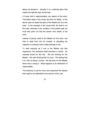 To start enjoying as if one is the Master and that experience, the anubhava itself becomes a virodhi. An example would be like this. We are working for the Master. We start thinking that it is ours. The feeling that it is I who is doing it comes. We say that it is the Master alone who is doing it. What happens is an abdication of responsibility.