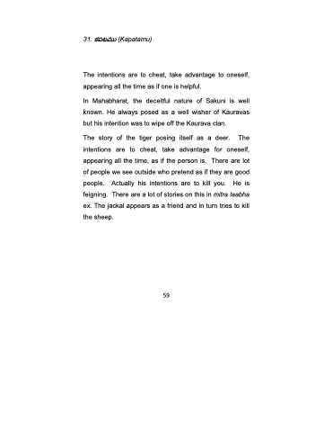 The story of the tiger posing itself as a deer. The intentions are to cheat, take advantage for oneself, appearing all the time, as if the person is. There are lot of people we see outside who pretend as if they are good people. Actually his intentions are to kill you. He is feigning. There are a lot of stories on this in mitra laabha ex. The jackal appears as a friend and in turn tries to kill the sheep.