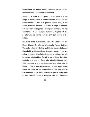 Out of 14 lokas, 7 lokas are below. The upper lokas are Bhuh, Bhuvah, Suvah, Mahah, Janah, Tapah, Satyam. The adho lokas are below and Sutala means balanced plane but it is of inferior type, it remains below. If you are going to look at it vertically, from top to bottom, you will be getting into troubles. For all seven of them, if we take posterior and anterior, if you take a bright side and dark side, the dark side is the lower and the bright side is higher. That is the real meaning. If you keep it one above the other, we get into confusion. We don’t see so many centers in the body. There is always a darker side for every center. There is a brighter side and there is a
