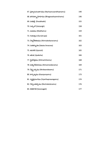 67. ైాయ్నుసంానము (Nychyanusandhaanamu) 140 68. భగవావ్హము (Bhagavadvyamohamu) 146 69. పరభకత్ి (Parabhakti) 155 70. సతస్ంగ్ (Satsangh) 158 71. మధము (Madhamu) 159 72. గురుకృప (Gurukrupa) 161 73. రమ్కరణము (Nirmaleekaranamu) 162 74. సతతసమ్రణ (Satata Smarana) 163 75. ఉపర (Uparati) 165 76. ఉేకష్ (Upeksha) 166 77. థ్ిరతత్ము (Sthirachittamu) 168 78. ఆతమ్ేదనము (Atmanivedanamu) 169 79. రద్ందవ్ము (Nirdwandwamu) 171 80. కారప్ణయ్ము (Kaarpanyamu) 173 81.వయ్రథ్పసర్ ంగము(Vyarthaprasangamu) 174 82. శచ్లతతవ్ము (Nischalatatvamu) 176 83. శరణాగ (Saranagati) 177