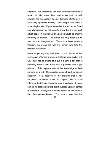 empathy. The person will not even have an inclination to work. In olden days, they used to say that one with prakami has the capacity to enter the body of others. It is not a very high state actually. Lot of people think that it is a very high state. If you remember the stories of Bhatti and Vikramarka you will come to know that it is not such a high state. In the stories, one person would be entering the body of another. The stories are very clear but we use our own imaginations. There is nothign wrong in tradition, the wrong lies with the person who tells the tradition incorrectly.