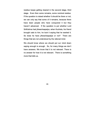 residue keeps getting cleared in the second stage, third stage. Even then some remains, some nominal residue. If the question is raised whether it should be there or not, we can only say that some of it remains, because there have been people who have conquered it but they haven’t advanced. If the question is put whether Lord SriKrishna had jihwachaapalya, when Kuchela, his friend brought oats to him, he took it saying that he wanted it. So does he have jihwachaapalya or not? There are things that are not understood by the rational mind.