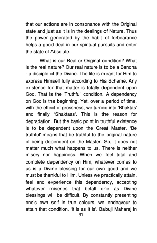 his Masterly stroke said about God \u2018He is neither Saguna nor Nirguna but beyond both; He is what He is\u0027. Once we correlate \u2018Truthfulness\u0027 as \u2018It is as It is\u0027, we may get an idea of its proximity to or even part of Absolute itself. It is this Divinity in us that should be presented in its true colours so that we can, with the support of the Master, enter that sphere.\u000ALalaji Maharaj considered three things necessary for a Saint. One, permanent bodily ailment; two, financial stringency and three, Nindak - being found fault with. This invitation to ailments, miseries, sorrows and the like would develop in us the quality of forbearance and habit of truthfulness simply because we start seeing the \u2018self\u0027 in its true colours oblivious of the superfluities of miseries, diseases etc. and other physical impediments. In this case, such ailments are really Divine blessings for our spiritual amelioration and we should be thankful to Him. The axiom of Rev. Babuji Maharaj that \u2018physical ailments are really meant for the cure of spiritual diseases\u0027, is a Truth. The medicine may be bitter and in the end, when we are cured and reach the Destination, we must always thank the Divine Doctor - the Master. We will always do this. Everybody does the same.\u000AMan is a bipolar being. It has got its roots nearest to the Base and the other end towards the\u000A98\u000A