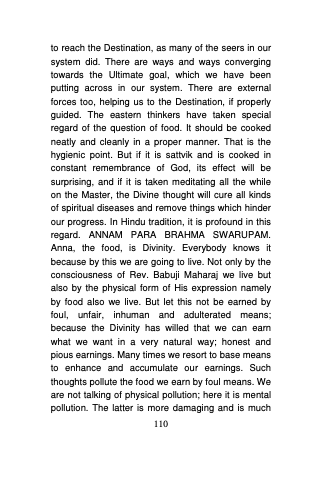 worse. When we eat it, the effect taken in by it enters our body and begins to spread all through our veins and arteries. So, if we take such food which is earned through honest and pious means, then, the particles and atoms of the body begin to get purified. The impulse of Divine thought thereby combines with food and helps to promote our physical and spiritual health.\u000ACOMMANDMENT 9\u000A\u201CMOULD YOUR LIVING SO AS TO ROUSE A FEELING OF LOVE AND PIETY IN OTHERS\u201D.\u000AThe kingly thing in the man is thought. Prana is the life energy which is essentially in the nature of consciousness. This thought is the Prana in the human context. It is thought, as we talked earlier, that is common between man and the Ultimate. We get power from our thought only when it has proper interface with the Absolute and there is perfect harmony between things of our own making and those of the Divine. As far as Vyavahara (practical dealings) is concerned, there is absolute uniformity in Divine dealings but only in a particular sense. For example, He gives light equally to all. He has created air for everybody to freely breathe in. The water, the Nature\u0027s resources and all are His creations. There is everything for \u2018life\u0027 and \u2018human\u0027\u000A111\u000A