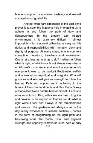 under all circumstances. Such is the efficacy of Bed time prayer and more, such is the certain and unfailing way of getting the Master\u2019s grace and support. Let each one of us resolve now to abjure the ways of selfishness, ego and unabashed materialism and benefit from the Master\u2019s Divine support to transform oneself into a real man and thus to be His partner in restoring human values and world order through the Natural Path. Amen.\u000A118\u000A